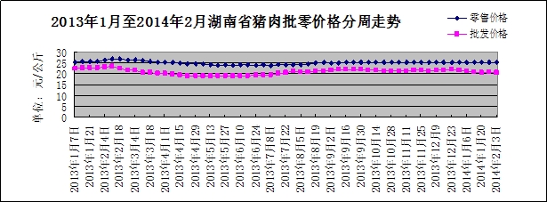 猪肉批零均价双双回落。今年春节期间,我省生猪市场行情疲软,猪肉批发价格小幅震荡下降,零售价格也开始下降。本周,我省猪肉批发均价20.5元/公斤,下降1.58%;猪肉零售均价25.26元/公斤,下降0.2%。其中,鲜猪肉零售均价24.55元/公斤,下降0.2%;精瘦肉零售均价27.91元/公斤,下降0.04%;五花肉零售均价23.32元/公斤,下降0.34%。本周,鲜牛肉批发均价67.23元/公斤,下降1.18%;鲜羊肉批发均价64.13元/公斤,下降0.57%。按照惯例,春节过后的肉品需求会出现阶段性的下降,猪市行情或难在短期内好转,预计后市猪肉价格仍将低位运行。