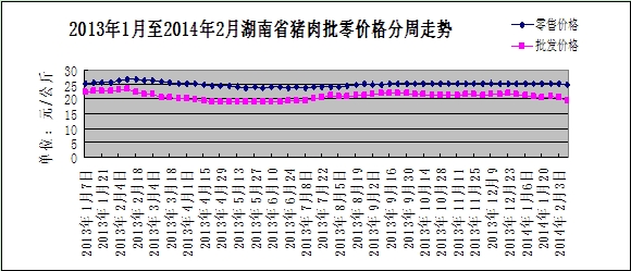 猪肉价格继续下降。由于生猪价格低迷不振,随着节日消费因素消退,猪肉批零均价下降幅度明显扩大。本周,我省猪肉批发均价19.54元/公斤,下降4.68%,降幅较上周扩大3.1个百分点;猪肉零售均价24.98元/公斤,下降1.11%,降幅扩大0.91个百分点。其中,鲜猪肉零售均价24.05元/公斤,下降2.04%;精瘦肉零售均价27.95元/公斤,上涨0.14%;五花肉零售均价22.95元/公斤,下降1.59%。本周,鲜牛肉批发均价66.75元/公斤,下降0.71%;鲜羊肉批发均价62.69元/公斤,下降2.25%。春节长假结束,肉类消费低迷行情难以逆转,预计短期内猪肉价格继续弱势运行。