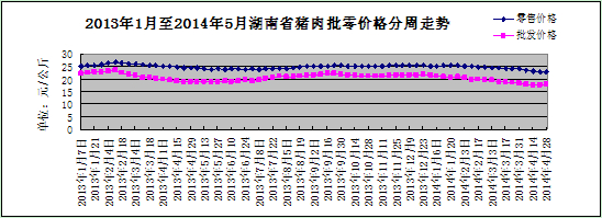 猪肉批发均价继续略涨,零售均价继续略降。传统“逢节必涨”的肉价波动规律今年五一期间没有出现。本周,我省猪肉供应充足,价格基本稳定。猪肉批发均价17.84元/公斤,上涨1.02%;猪肉零售均价22.71元/公斤,下降0.61%。其中,鲜猪肉零售均价21.99元/公斤,下降0.9%;精瘦肉零售均价25.22元/公斤,下降0.59%;五花肉零售均价20.91元/公斤,下降0.43%。本周,鲜牛肉批发均价62.4元/公斤,下降0.19%;鲜羊肉批发均价58.5元/公斤,上涨0.43%。从目前情况来看,5-6月份仍是生猪的需求淡季,而近期养殖户看涨后市,惜售压栏情况增多,市场供过于求的形势还将延续,猪价触底拐点短期内不会出现,猪肉价格将继续低位震荡徘徊。
