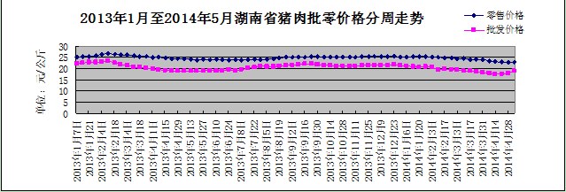 猪肉批发均价涨幅扩大,零售均价止跌反弹。五一节后我省猪肉价格出现恢复性上涨。本周,猪肉批发均价18.79元/公斤,上涨0.95元/公斤,涨幅5.33%,比上周扩大4.31个百分点;猪肉零售均价22.74元/公斤,上涨0.13%,扭转了长达13周的连续略降趋势。其中,鲜猪肉零售均价21.97元/公斤,下降0.09%;精瘦肉零售均价25.3元/公斤,上涨0.32%;五花肉零售均价20.96元/公斤,上涨0.24%。本周,鲜牛肉批发均价62.21元/公斤,下降0.3%;鲜羊肉批发均价58.5元/公斤,持平。近期国家开始启动第二批中央储备冻猪肉收储,短期拉动生猪价格,带动猪肉价格上涨,但目前正是猪肉消费淡季,猪肉价格上涨缺乏有力的支撑,预计近期猪肉价格波动不大。