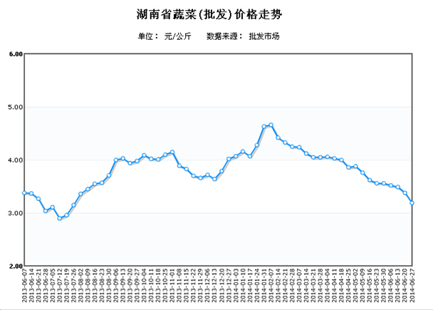 目前我省蔬菜价格低位运行,受雨季影响较小,叶菜类因容易腐烂,价格略有上涨,但本地应季瓜果类类上市量较大,蔬菜价格整体回落,预计短期内不会逆转。