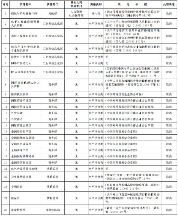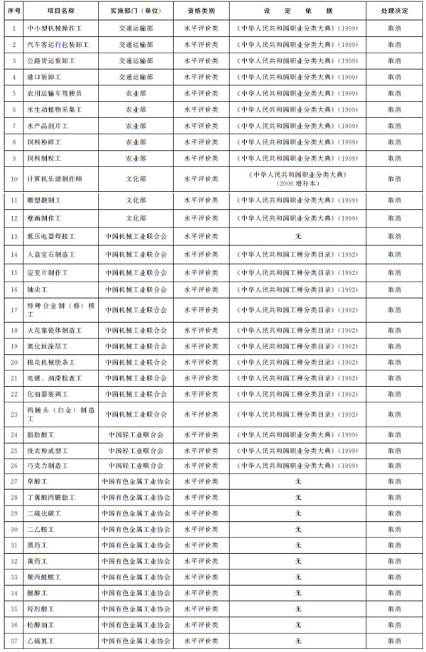 国务院决定取消的职业资格许可和认定事项目录(共计62项)