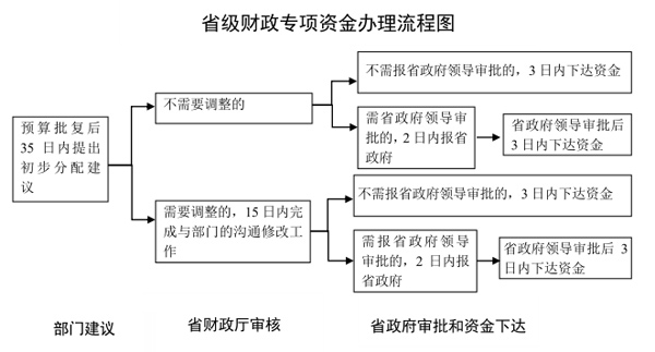 (二)省级财政专项资金一般应在预算批复后60日内分配下达。省直部门应在预算批复后35日内提出分配下达意见;省财政厅在收到省直部门分配下达意见后尽快进行审核,经审核不需调整的,在3日内下达资金,按要求需报省政府领导审批的,在2日内报省政府领导,如果需要进行调整完善的,在15日内完成与部门的沟通修改工作,修改完成后2日内报省政府领导审批,省政府领导批准后3日内下达资金。