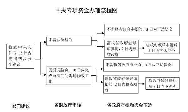 (三)中央专项资金接到文件后一般应在30日内分配下达。省直部门应在接到文件后12日内提出分配下达意见;省财政厅在收到省直部门分配下达意见后尽快进行审核,经审核不需调整的,在3日内下达资金,需报省政府领导审批的,在2日内报省政府领导,若需要进行调整完善的,在10日内完成与部门的沟通修改工作并报省政府领导审批,省政府领导批准后3日内下达资金。