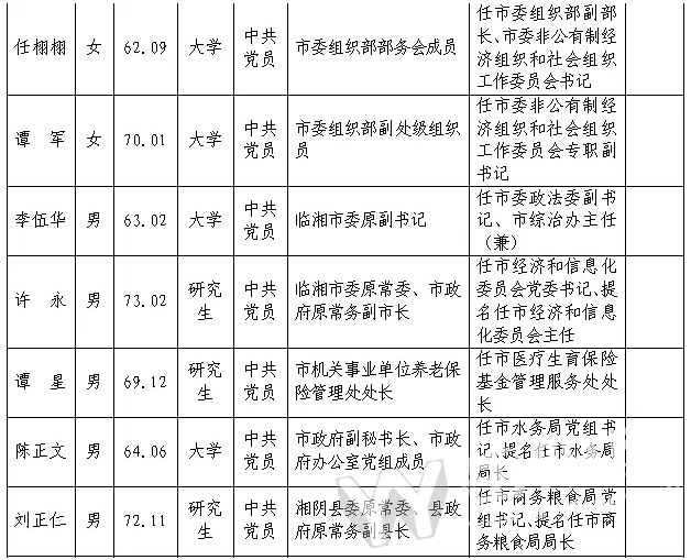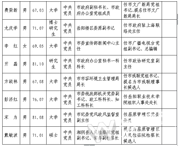 红网岳阳分站12月23日讯 (通讯员 岳新)为了加强对干部选拔工作的监督,提高识别和任用干部的准确程度,中共岳阳市委组织部现对岳阳市委常委会议研究决定的下列21名拟任职人选(提名人选或候选人人选)进行任前公示: