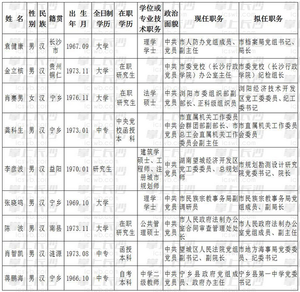 长沙晚报1月18日讯(记者 黎铁桥)为加强对干部选拔工作的监督,提高识别和任用干部的准确程度,现对中共长沙市委常委会会议研究同意的拟任人选进行任前公示: