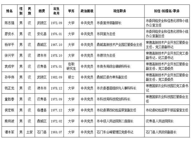 红网时刻9月12日讯 根据《干部任用条例》及有关规定,现对湖南省常德市委常委会议研究决定的下列拟任职对象进行任前公示: