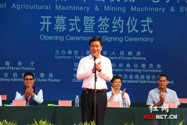 红网时刻9月27日讯(记者 刘玉先 谭卫丰)9月27日,以“智能制造 湘品出湘”为主题的湖南省第八届农业机械、矿山机械、电子陶瓷产品博览会在娄底开幕。湖南省副省长何报翔宣布博览会开幕,娄底市委书记、市人大常委会主任李荐国致辞。