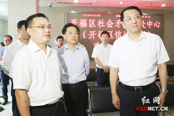 10月10日上午,湖南省委常委、省委政法委书记黄关春一行到长沙市督查党的十九大安保维稳工作。图为黄关春(右)在长沙市开福区信访接待中心督查安保维稳工作。