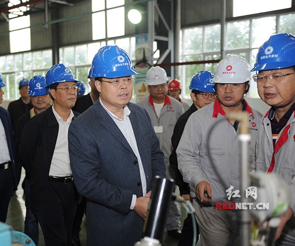 湖南省副省长、省国资委党委书记张剑飞(前排左一)在湖南湘投金天新材料有限公司调研。