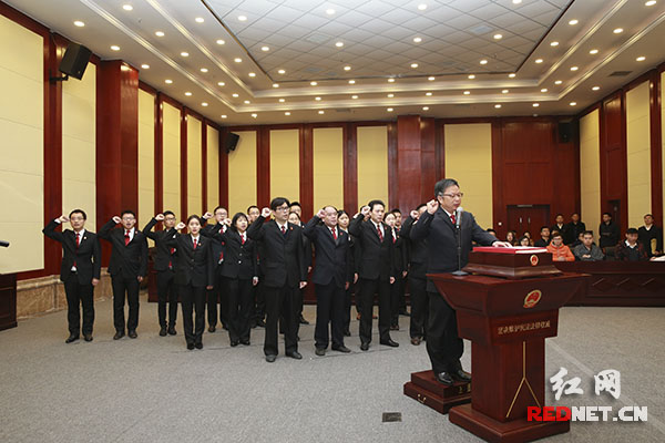 湖南高院宪法宣誓仪式现场,湖南高院副院长杨翔(右一)领誓。