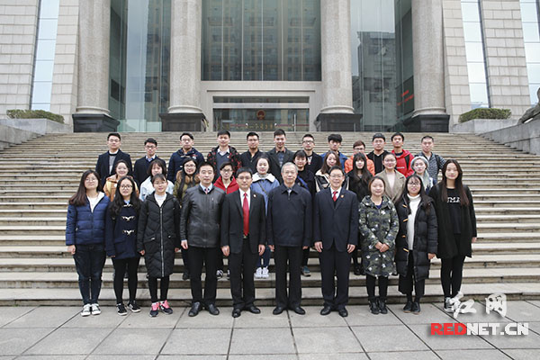 湖南高院党组书记、院长康为民(前排右五)与长沙大学法学院师生合影。