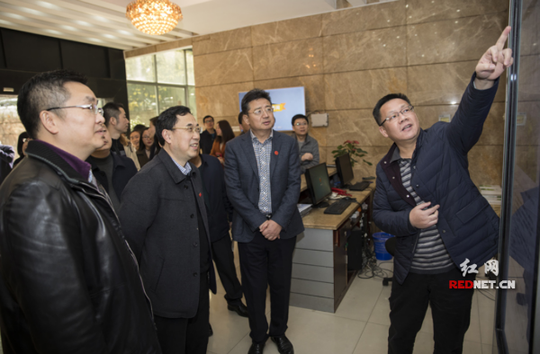 湖南出版集团党委委员、副总经理、湖南红网新媒体集团党委书记、董事长舒斌向湖南省财政厅副厅长庄大力(前排左三)一行介绍红网时刻新闻客户端。