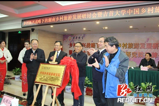 红网时刻12月17日(张家界分站记者 王洁)12月16日,吉首大学中国乡村旅游研究院正式挂牌成立,创下全国设立专门研究乡村旅游研究院的先例。省政协党组原副书记、副主席武吉海,省旅游发展委员会主任陈献春,市委副书记、代市长刘革安,吉首大学党委书记游俊,湘西州副州长李平共同为吉首大学中国乡村旅游研究院揭牌。市委副书记刘绍建,副市长欧阳斌,吉首大学副校长罗金铭出席揭牌仪式或调研。
