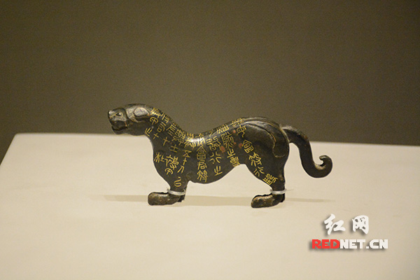 这件杜虎兵符青铜质地,模仿虎的形态,身上的错金铭文有9行,共40字,用于调动秦国驻扎在杜地的军队。